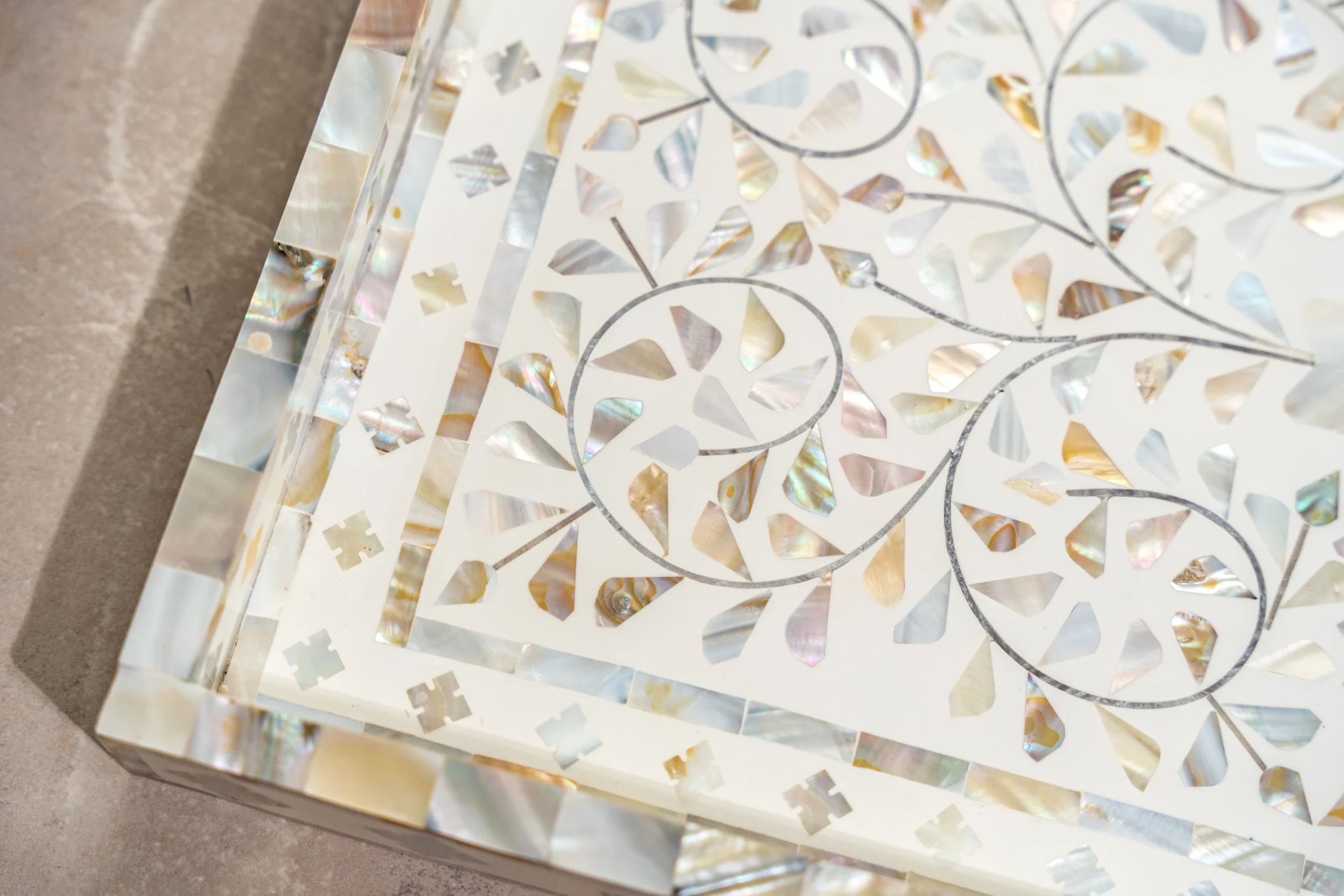 Mother of pearl inlay tray is one of a kind masterpiece, It is ideal for serving, storing, and displaying in style, it reflects the beauty of natural materials and the skill of the artisan.