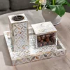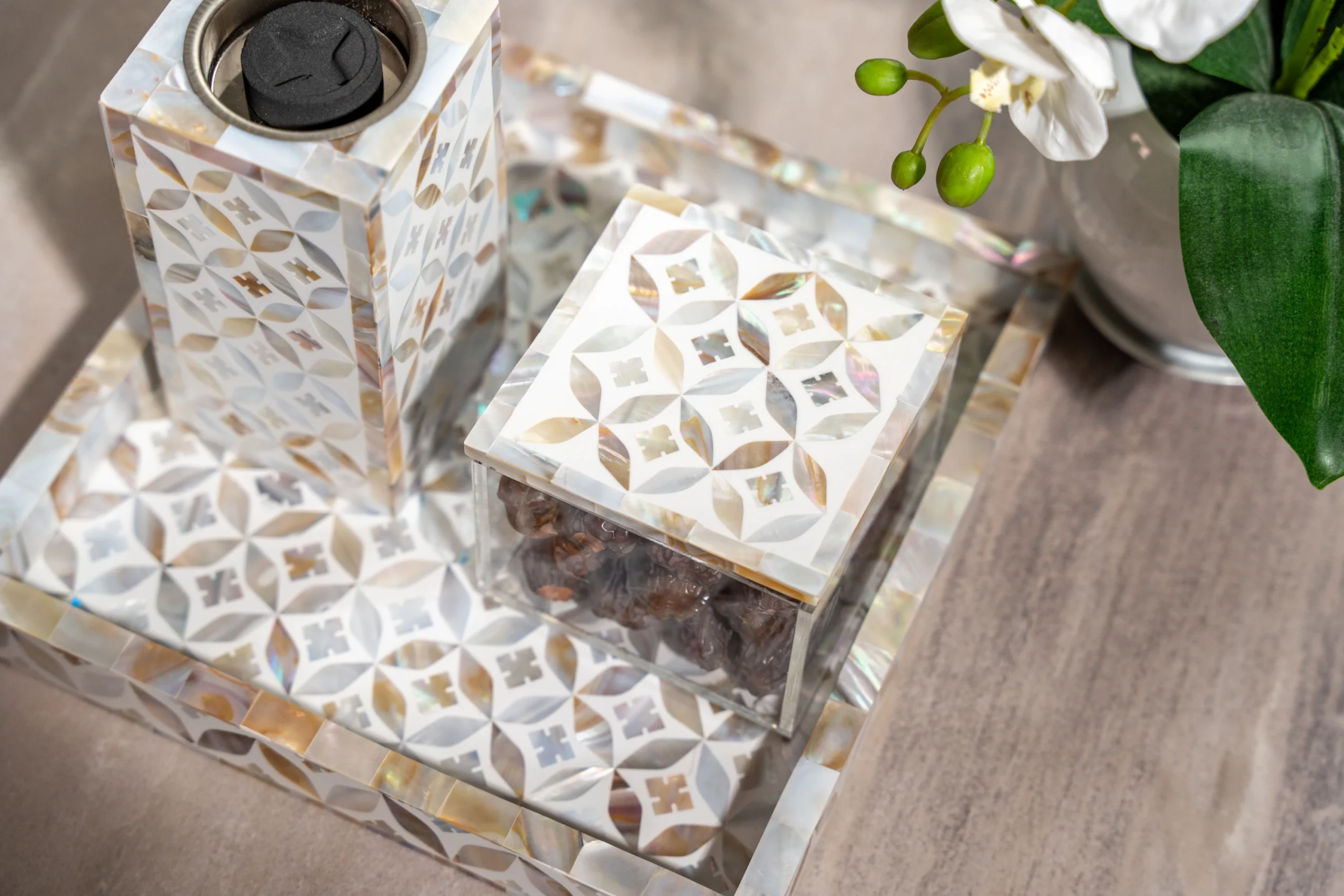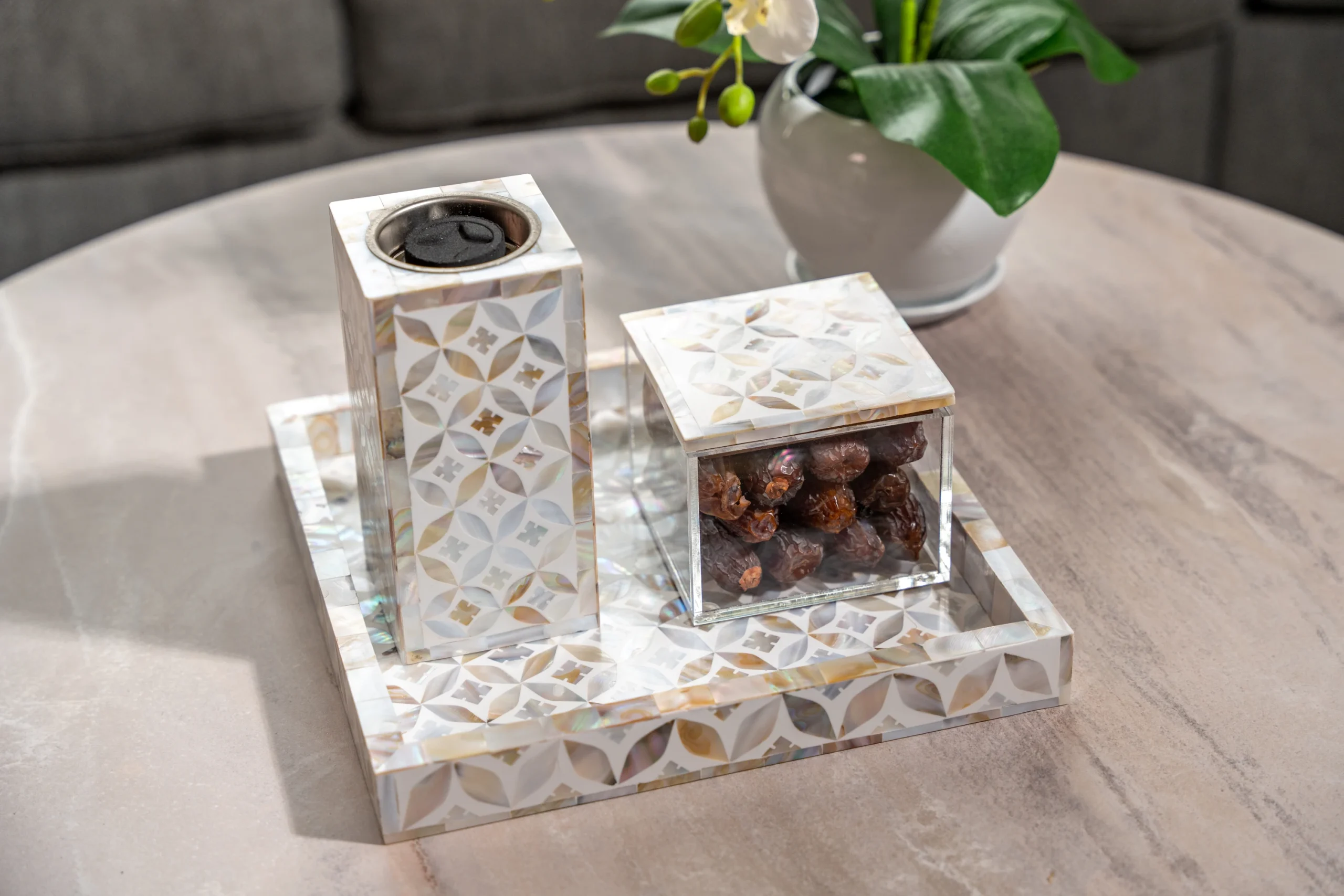 Mother of pearl inlay set of handcrafted square tray, Mabkhara for burning incense, and matching box to store your finest oud.