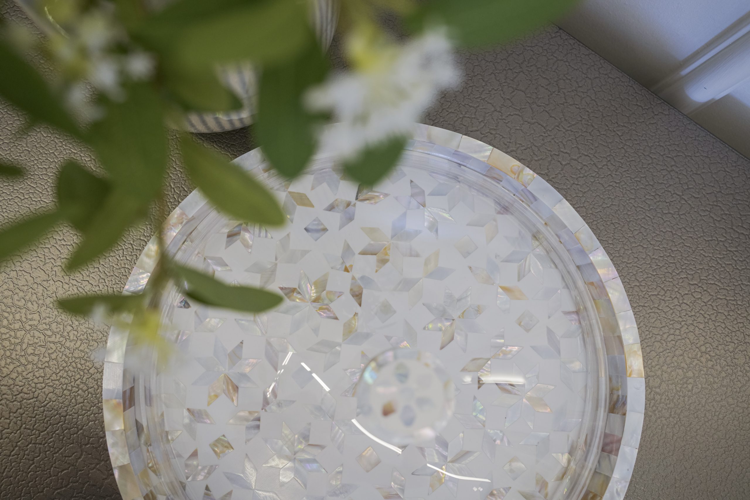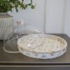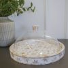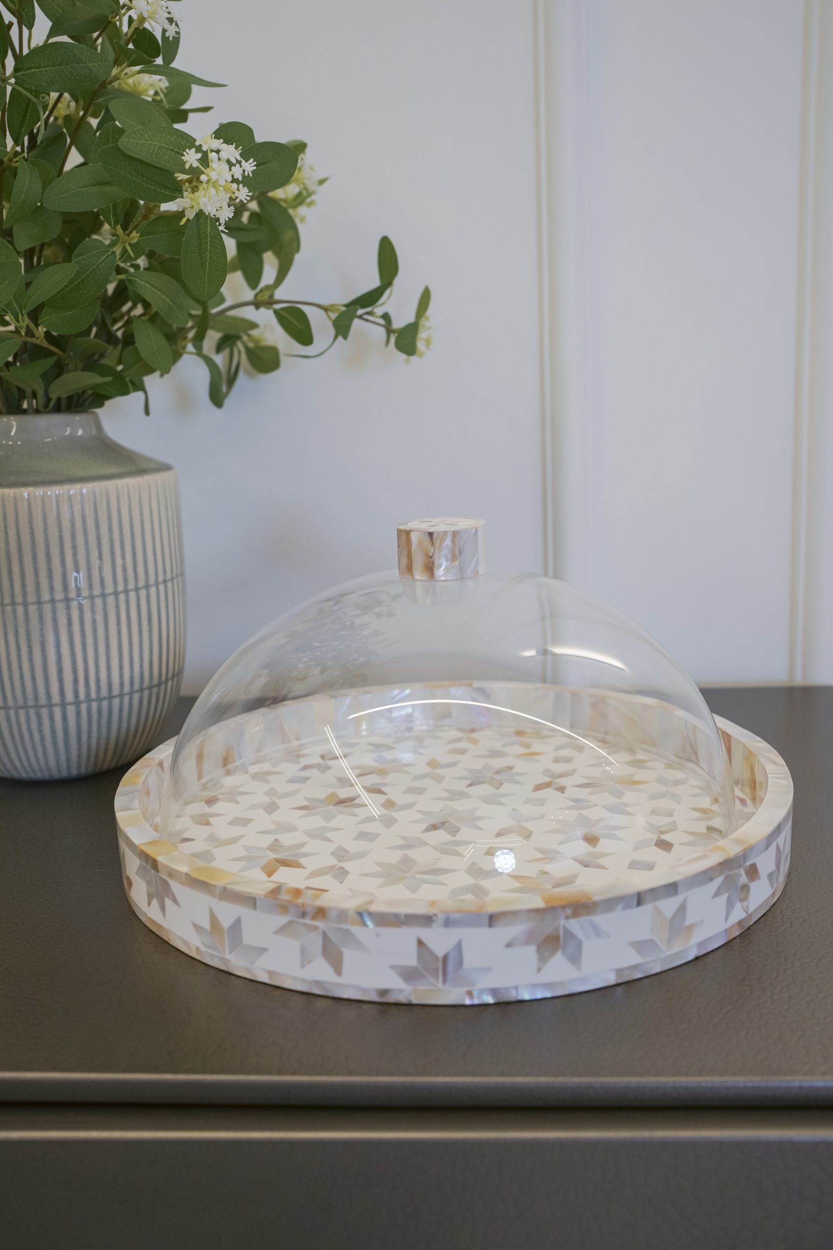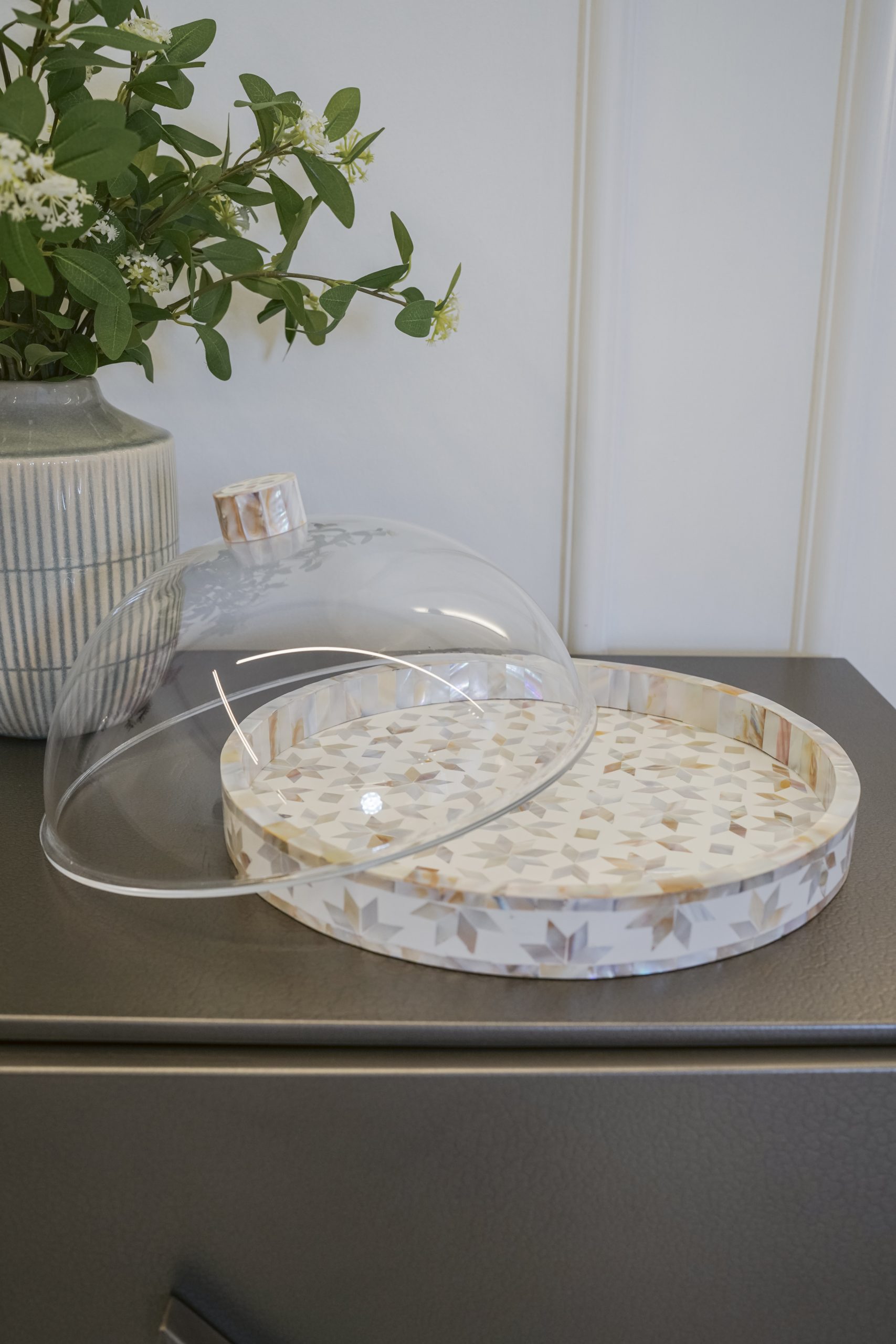 Mother of pearl sweet plate handcrafted with intricate inlay work the shimmering mother of pearl details create a timeless piece with a sleek acrylic cover that keeps your treats protected and acrylic base to maintain your plate.