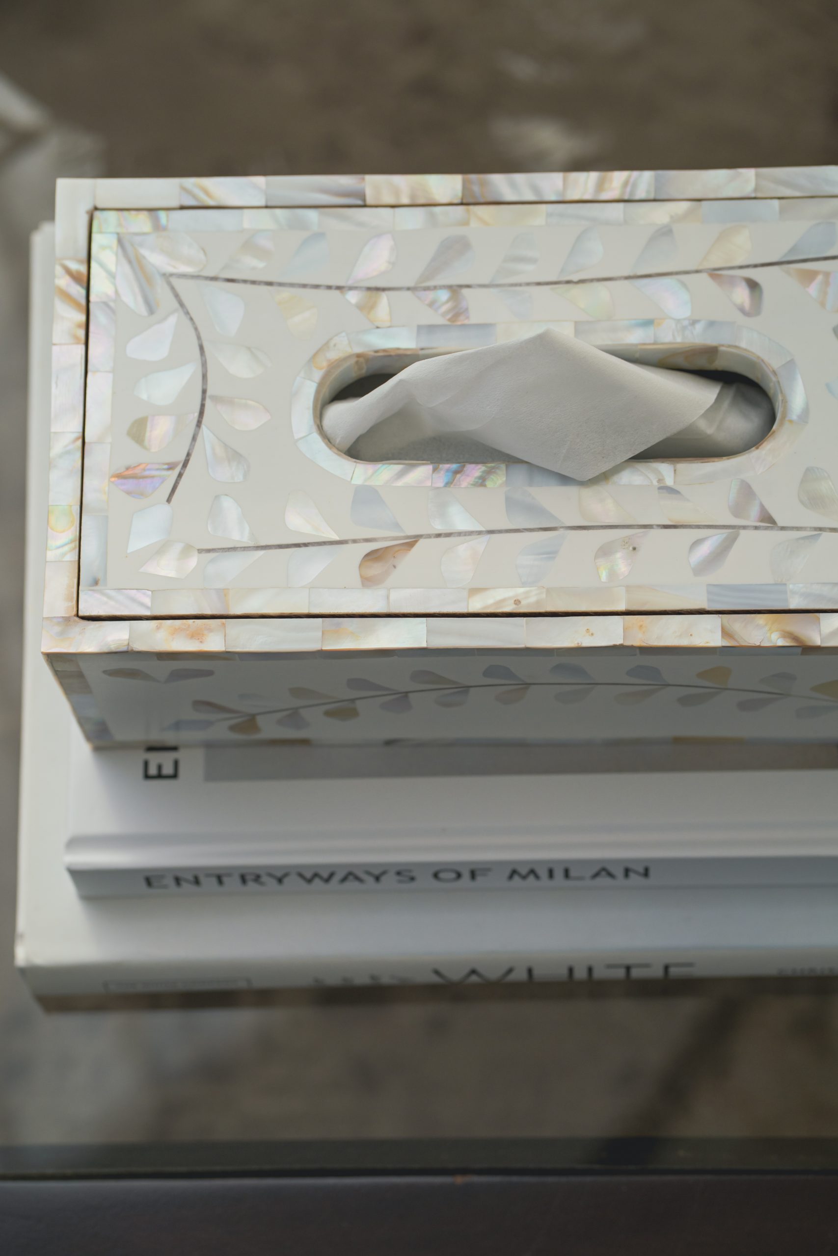 Wooden tissue box inlaid with natural mother of pearl , designed with a top-opening lid for easy use, it brings refined beauty and a touch of artistry to your home or office .